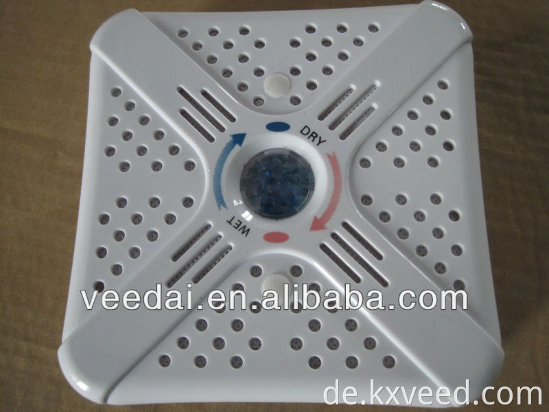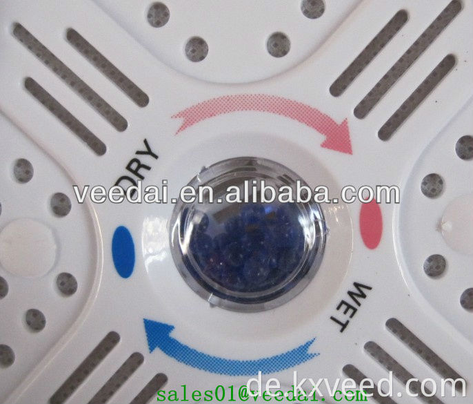 How to use | when the indicator window is blue,place the unit in a suitable location,the unit will take moisture from the surrounding area ,(the unit will increase in weight as it gathers moisture).when the unit is full,the indicator window will become pink.plug in the unit and recharge overnight or unit the indicator window returns to blue.the dehumidifier will now be ready for use. |